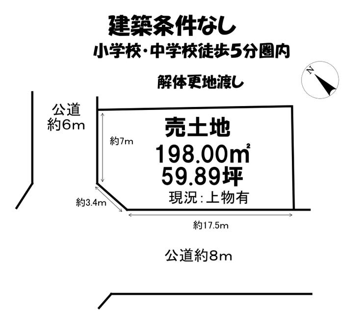 土地面積 公198㎡(59.89坪) 接道 北西側(公道)幅 約6.0m